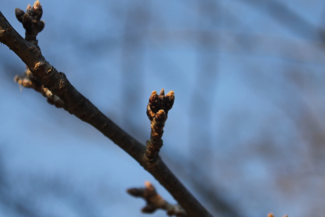 桜(さくら)の花芽(はなめ)です。小(ちい)さな手(て)のようにも見(み)えますが、ごつごつした力強さ(ちからづよさ)も感(かん)じられます。