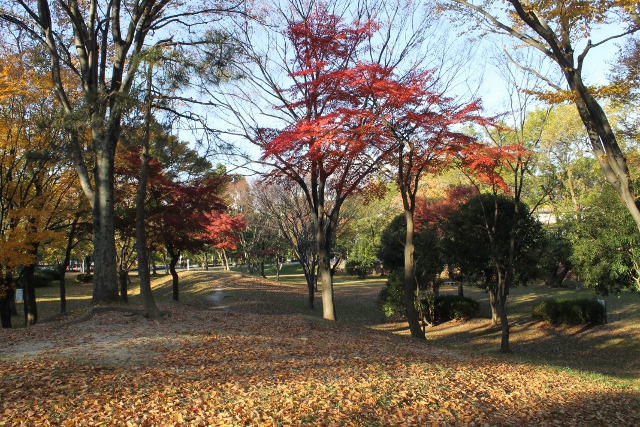 朝日が射して落ち葉が敷き詰められた緑地の部分を明るく照らし出していました。