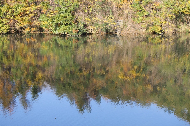 オシドリがいるかなと思って鳥見の台からのぞいた安場池です。池に写った山の景色が抽象画のように見えました。
