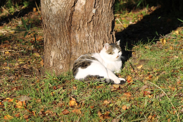 いつもの猫は遊歩道の横の大きな木にもたれて、まったりしていました。