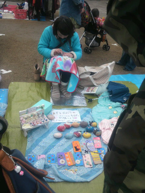 フリーマーケットで一生懸命(いっしょうけんめい)に刺繍(ししゅう)をする売り子(うりこ)さんです。