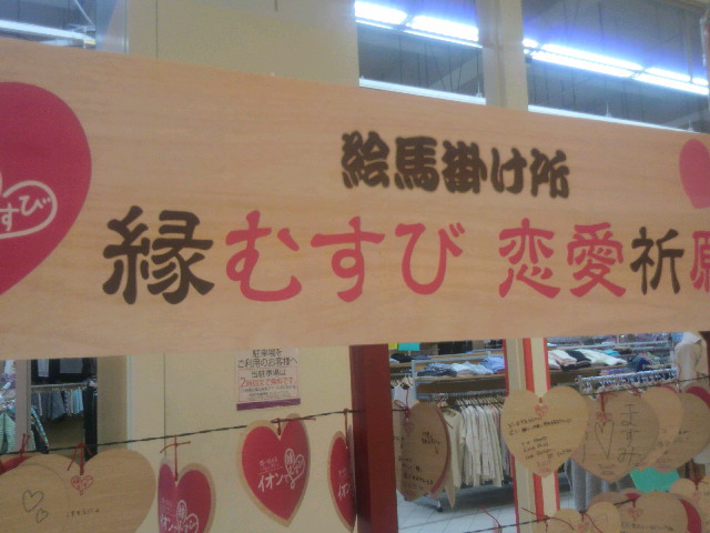 イオンの2階(かい)で見(み)かけた縁(えん)結(むす)び恋愛祈願(れんあいきがん)の絵馬(えま)です。