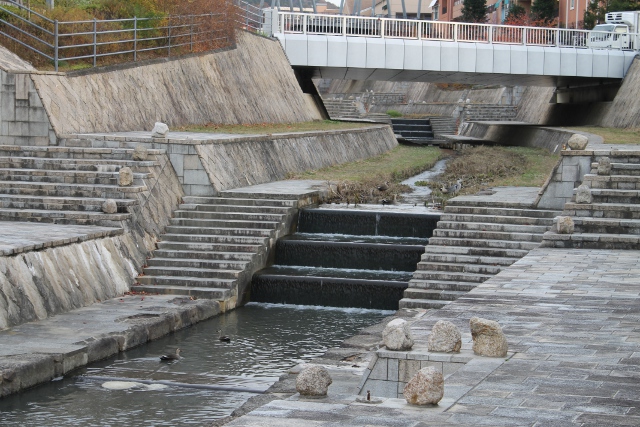 今朝の千里川です。まず目についたのはカモが二羽、下の段で泳いでいました。
