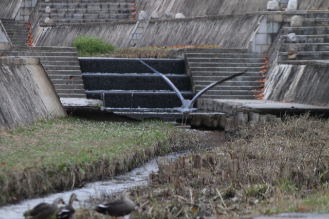 階段の手前でアオサギに気づかれてしまいました。アオサギが飛び上がった瞬間です。