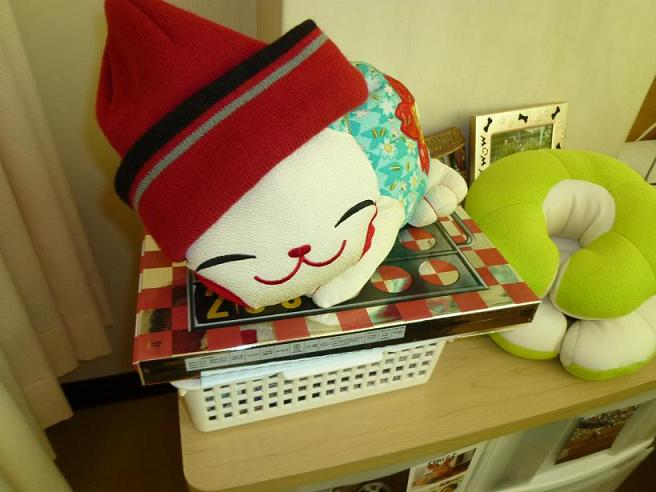 一月のやわらかい日差しを受けて、あたたかい雰囲気の部屋になっていました。ふと見ると、ベッドサイドにおかれた床頭台テーブルの上で可愛いネコが赤い帽子をかぶって笑っていました。