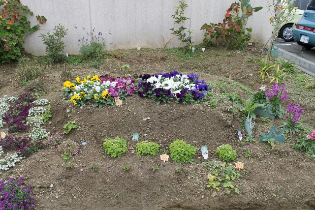いつもの小学校の花壇です。葉ボタンが植えられて近づくお正月を待っています。
