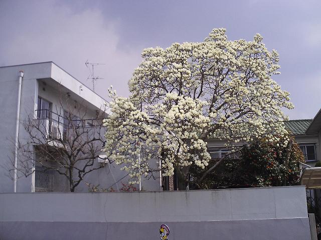 遠くから見ると真っ白い花が輝いて見えました。春の日差しを浴びてその木は大きな存在感で周りの住宅街を圧倒していました。
