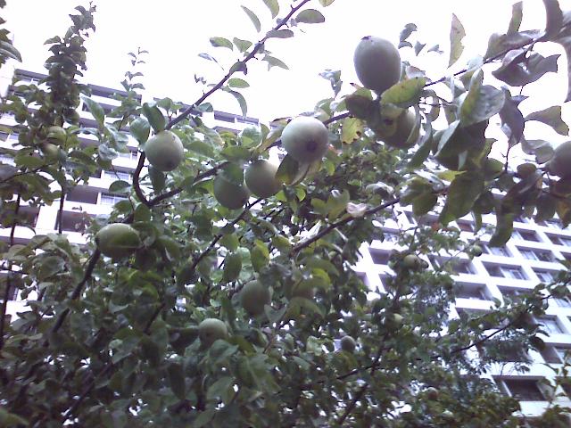 森ノ宮にある大きな住宅団地の道路に面したところにこんな大きな実がなる果物の木があります。リンゴなのか、ナシなのか、それとも新しい果物なのか、昨年の今頃も大きな実がなっているのを見ました。