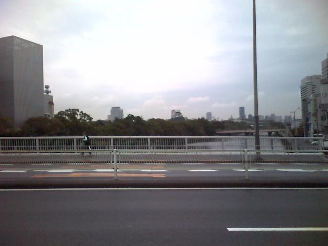 森ノ宮の駅から大阪城公園駅の方に歩きました。途中、寝屋川を渡るのですがその橋の名前が城見橋でした。橋の上の、通りの向こうでスーツを着たサラリーマン風の若い二人連れが携帯で大阪城を撮っていました。私も真似をしてお城を撮ってみたのですが・・・。