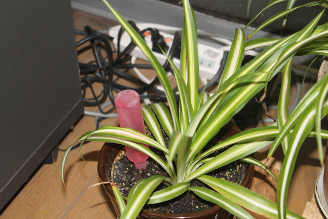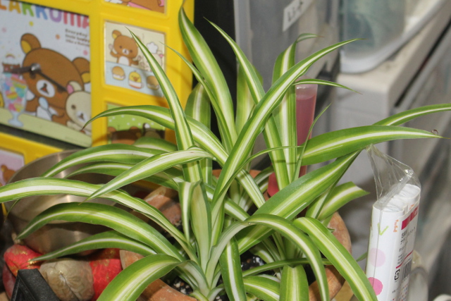 テレビの横(よこ)に置(お)いている同(おな)じく第(だい)2世代(せだい)の折(お)り鶴(づる)ランは細(ほそ)いまま長(なが)く長(なが)く伸(の)びてきました。