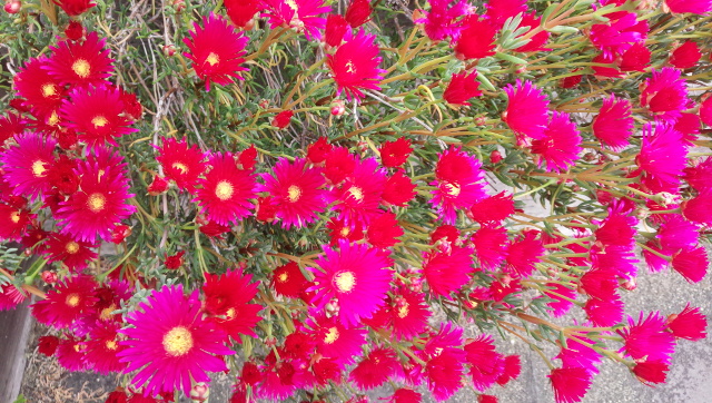 国立循環器病研究(こくりつじゅんかんきびょうけんきゅう)センターの4階(かい)のテラスに咲(さ)いていた松葉(まつば)ボタンです。曇(くも)り空(ぞら)の下(した)、パッと目(め)を引(ひ)く明(あか)るさでした。