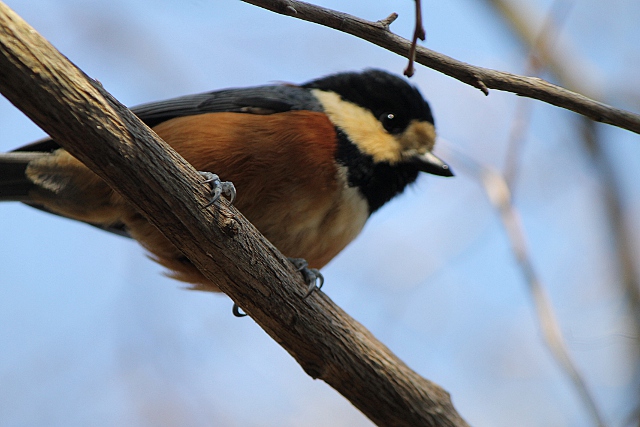 一番下(した)の枝(えだ)まで降(お)りてきてベンチに置(お)いた私(わたし)の蜜柑(みかん)をじっと見(み)ていました。