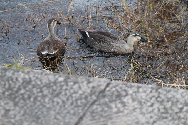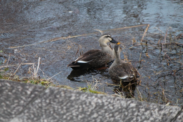 いつもはたくさんのカモがいるのですが、今朝(けさ)はこの二羽(にわ)しかいませんでした。嘴(くちばし)をくっつけて何(なに)か話(はなし)をしているみたいです。