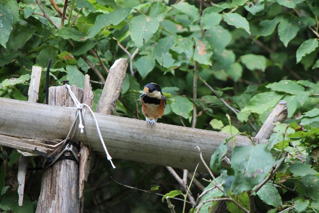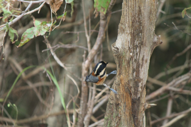 頭に白黒の縞がある1羽の鳥がえさ台のところにやってきました。