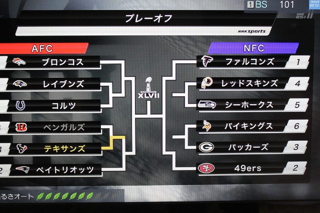 トーナメント表です。ペイトン・マニングのブロンコスは一位通過でゆうゆうの出場なのに、去年がんばったイーライ・マニングのジャイアンツは惜しくもワイルドカードを逃して出場できませんでした。