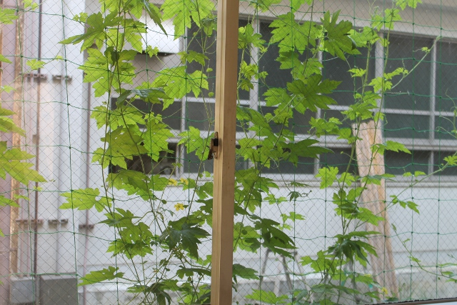 廊下側から撮影してみました。やがてこれが窓ガラスの面全体に拡がって「みどりのカーテン」になります。一年、あいだを置いたのは連作障害か何かあったのでしょうか?