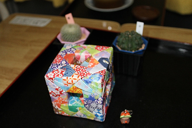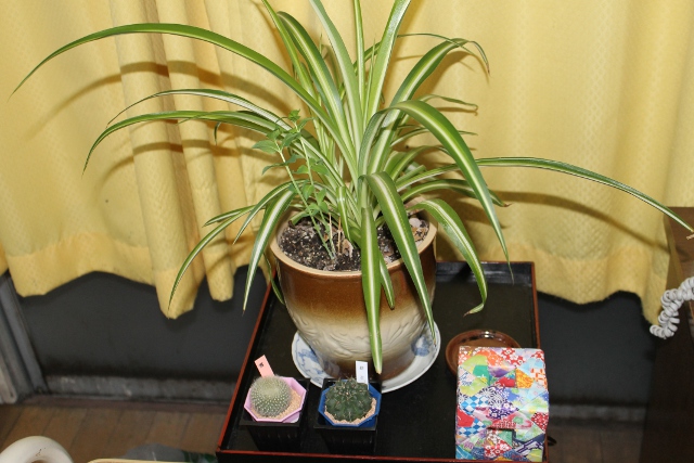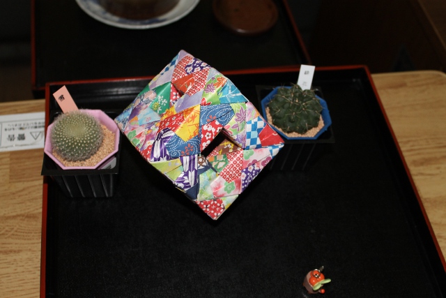 横で四角い折り紙細工を支えているのは最近我が家にやってきたサボテンくんたちです。