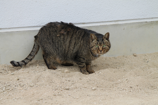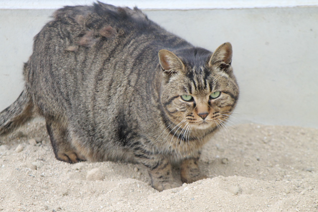 大(おお)きなネコににらまれました。背中(せなか)の毛(け)が生(は)え替(か)わるのでしょうか、抜(ぬ)けかかっています。