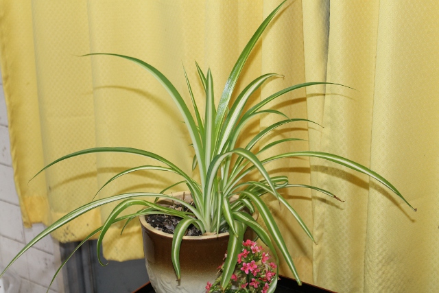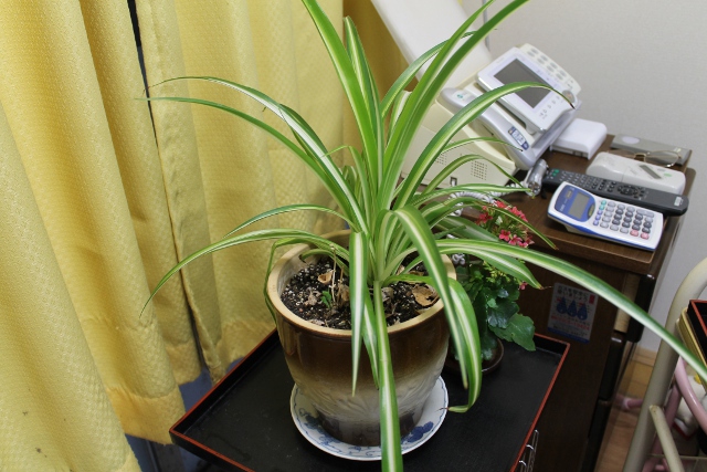 ベランダに出していた折り鶴ランがスラリと葉を伸ばして元気よく、室内に入ってきました。