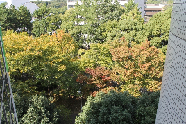 上から見てみようということで、すぐ横の建物の5階から並木道を上から撮影してみました。