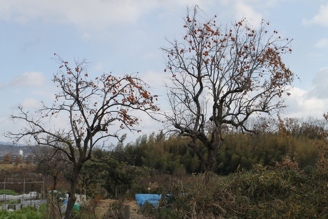 久(ひさ)し振(ぶ)りに勝尾寺古参道(かつおじこさんどう)を歩(ある)いてみようと出発(しゅっぱつ)したのですが、最初(さいしょ)に出会(であ)ったこの柿(かき)の木(き)の辺(あた)りで冷(つめ)たく溶(と)けかかったような粉雪(こなゆき)が降(ふ)ってきました。私(わたし)にとっては初雪(はつゆき)でした。