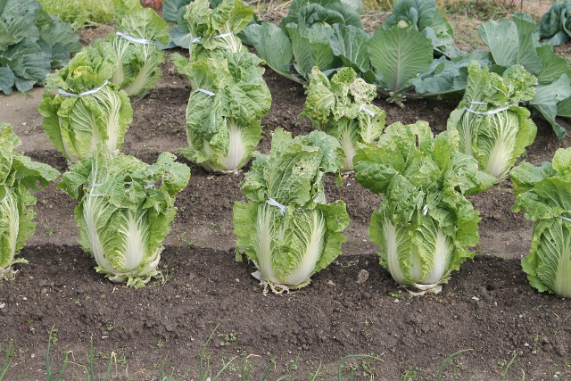 一株(ひとかぶ)ずつ外側(そとがわ)からヒモでくるんで大(おお)きく膨(ふく)らんできた白菜(はくさい)です。私(わたし)も以前(いぜん)に作(つく)ったことがあるのですが、このようにずっしりと葉(は)っぱを巻(ま)いてきた白菜(はくさい)は美味(おい)しいですよ。