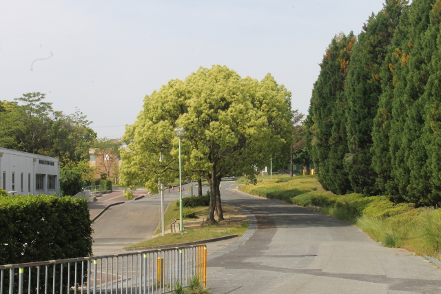 その北公園(きたこうえん)の北出口(きたでぐち)の方(ほう)です。左側(ひだりがわ)が体育館(たいいくかん)です。その前(まえ)に数本(すうほん)の大(おお)きなクスノキがあります。