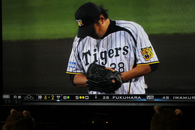 甲子園(こうしえん)のヤクルト戦(せん)、能見(のうみ)が安定(あんてい)したピッチングで7回(かい)まで投(な)げたのですが、ヤクルトの選手(せんしゅ)のタイミングが合(あ)うようになったせいか、7回(かい)途中(とちゅう)で安藤(あんどう)にスイッチしました。そのあと8回(かい)にこの福原(ふくはら)が登場(とうじょう)しました。