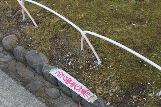 この歩道と緑地を分けている細い半円のポールも塗られていました。