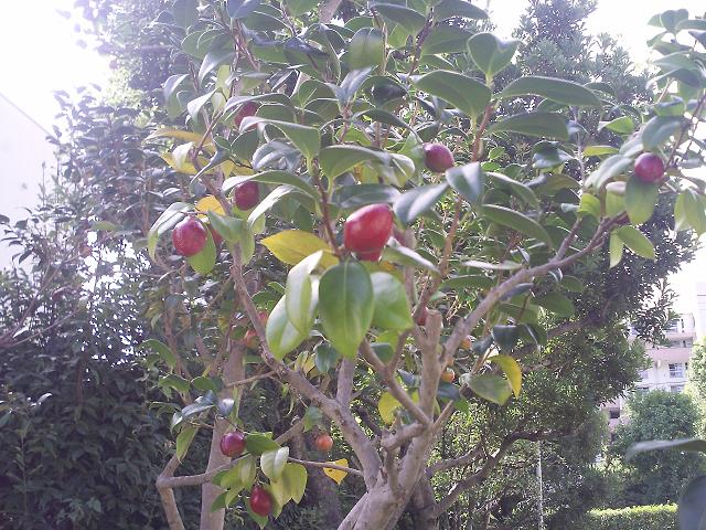 イチョウの木の前には大きな赤い実がなっている木がありました。