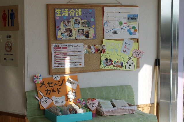 入り口にこのワーキングたんばのメンバーが作ったメッセージカードと牛乳パックで作った手作り葉書がありました。