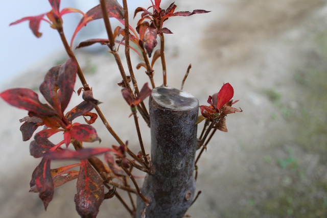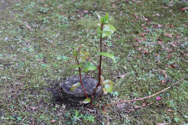 今年(ことし)の夏(なつ)に住宅(じゅうたく)のリニューアルで壁(かべ)の塗(ぬ)り替(か)えがあり、全面的(ぜんめんてき)にテントで覆(おお)われたために建物(たてもの)に近(ちか)い木(き)がいくつか切(き)られました。その切り株(きりかぶ)から新(あたら)しく芽(め)が出(で)てきています。