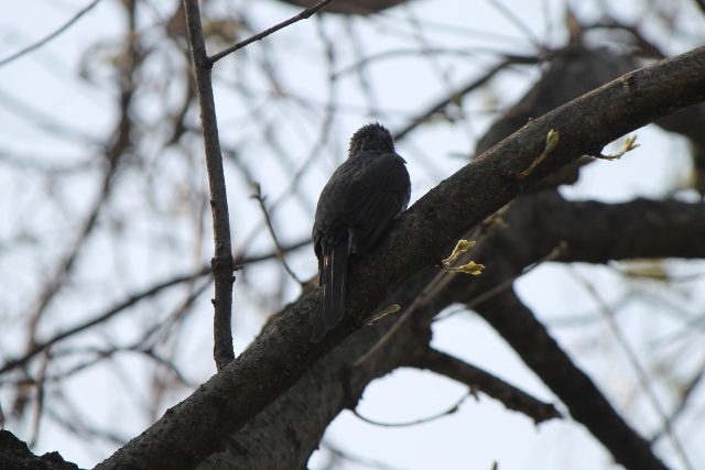 木(き)の上(うえ)に中(ちゅう)ぐらいの鳥(とり)が飛(と)んできました。こちらを向(む)いてくれず、向(む)こうを向(む)いてじーっとしていました。