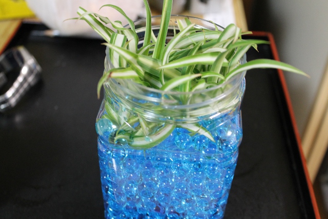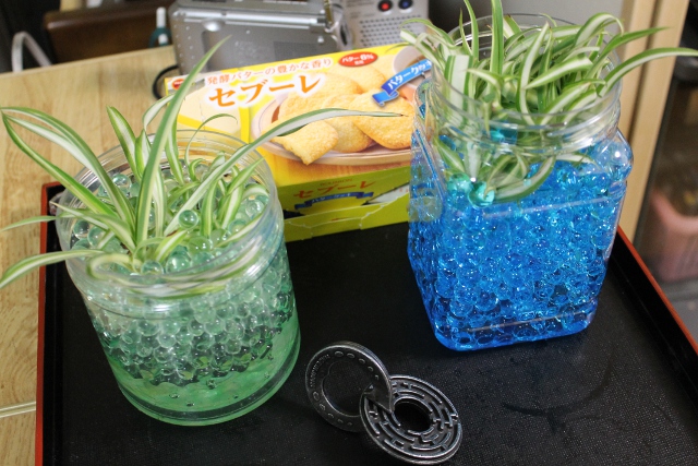 二日間水につけていたアクアプルンプルンがかなり大きくなったのでベランダで大きくなってきたオリヅルランの小苗をはさみでチョンチョンと切ってぎっしりと植え込んでみました。