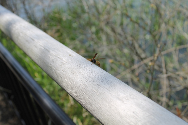 池を眺めようと近づくとアシナガバチが先に場所取りをしていました。