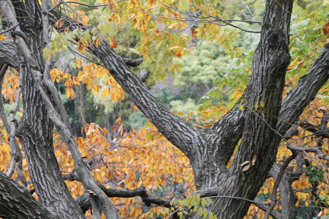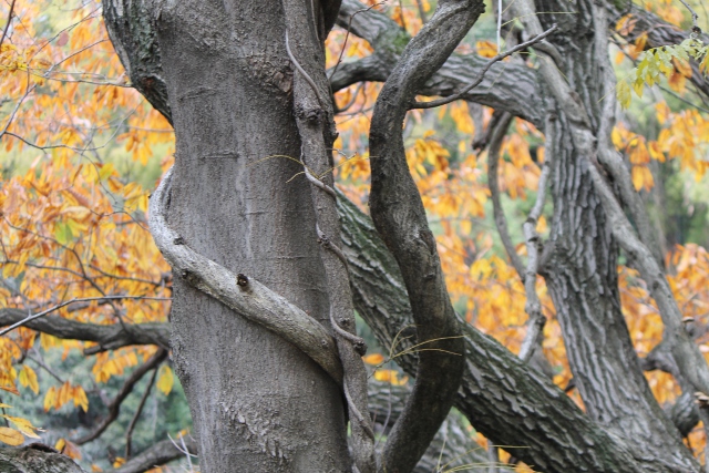 葉を落とした古木と大きな幹に巻き付いたヘビのような枝(たぶん最初はつるだったのでしょうね、それがこんなに太く枝のようになったのでしょうか)が、喧嘩をしているような眺めでした。