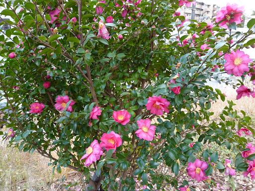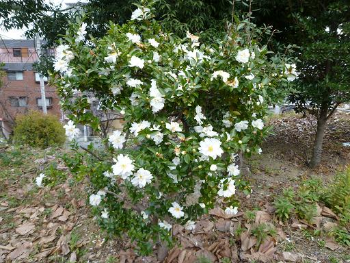 赤い山茶花と白い山茶花が競い合うようにして咲いていました。