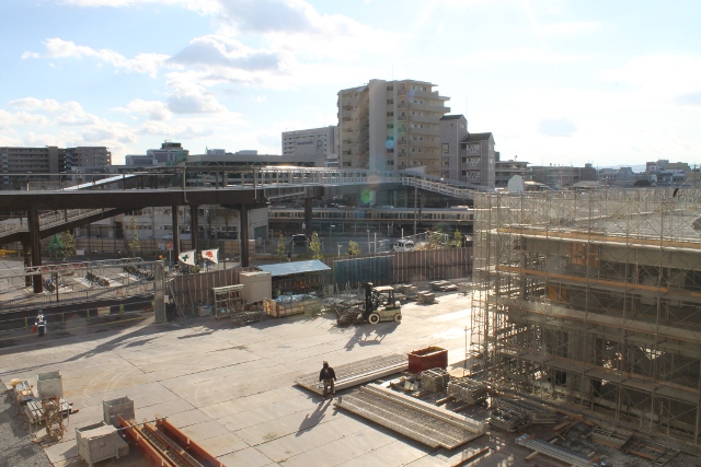 向こうの方に京都方面に向かう電車が走っています。三階の通路から現場を撮影しました。