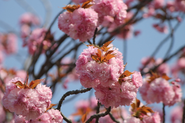 公園(こうえん)の入(い)り口(ぐち)にある八重桜(やえざくら)の桜(さくら)が見事(みごと)に満開(まんかい)でした。赤(あか)い花(はな)と白(しろ)い花(はな)が並(なら)んで咲(さ)いていました。