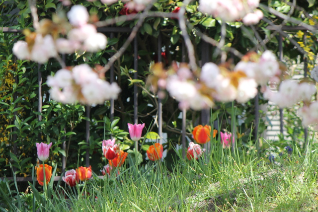 その白(しろ)い八重桜(いぇざくら)の裾(すそ)にチューリップが咲(さ)いているのが見(み)えました。一斉(いっせい)に咲(さ)くのですね。