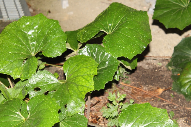 大きな石蕗(つわぶき)の葉が雨に濡れて光っていました。