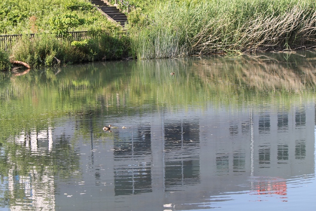 夏の池です。水の色も周りの植物も、朝の太陽の陽射しも夏の風景でした。