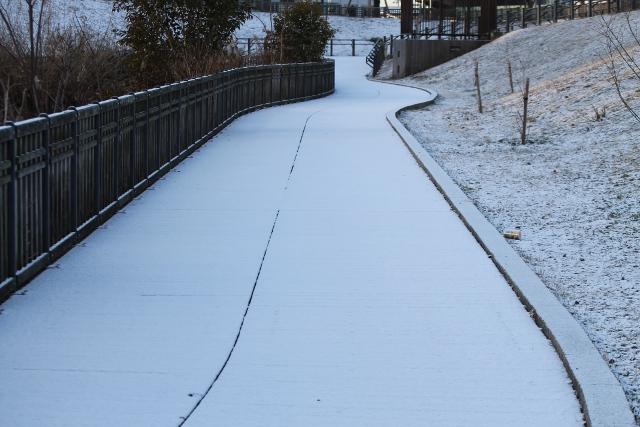木戸ヶ池公園の調整池の周りが真っ白になりました。