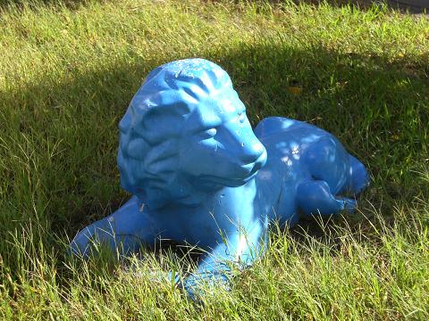大阪市内の公園です。芝生が伸びて伸びて波立っていました。そんな中にぽつんと一頭のライオンがいました。横には大きく口を開けたカバが二頭いました。