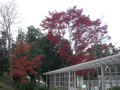 葉っぱを落としたイチョウの木やどうだん躑躅の真っ赤な丸っこい葉っぱが目に付きました。目を遠くにやると、真っ赤な、真っ赤な葉っぱのひと群れがありました。そこまで歩いて行き、真下からシャッターを切りました。