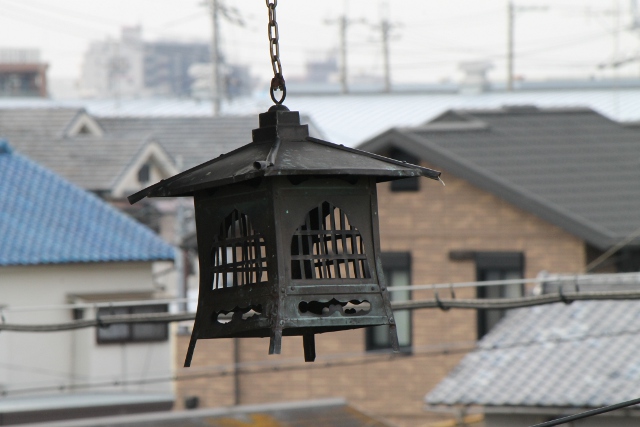 軒先にぶら下げる釣り灯籠に焦点を合わすと後ろの家の屋根がぼんやりと見え、ちょっと風情のある風景になりました。