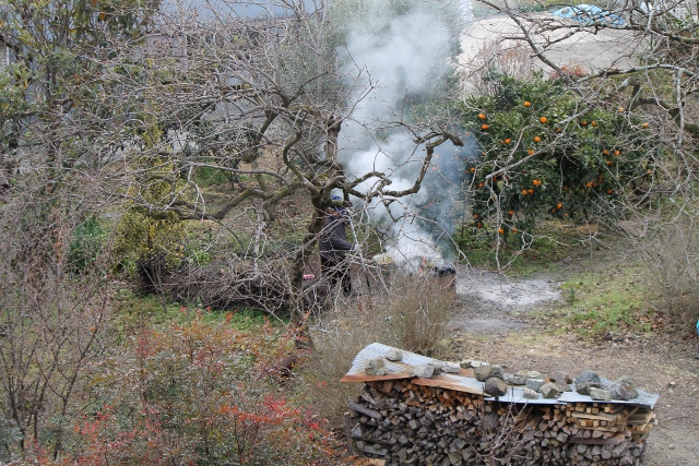 同じ土手の上から下を見ると、家の庭なのでしょうかたき火の煙が上がっていました。