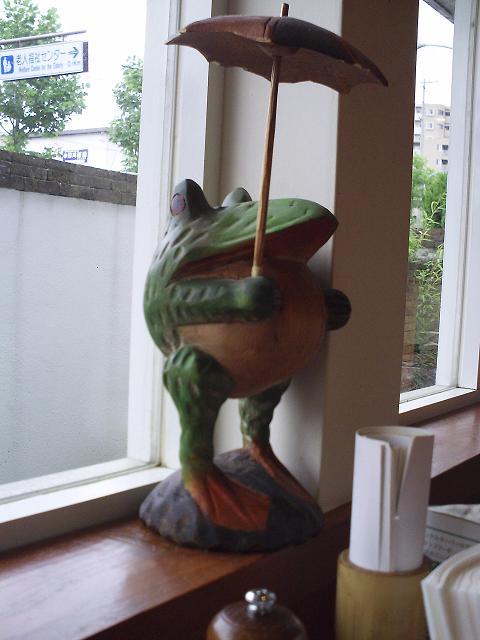 ランチを食べに行き、窓際の席に腰掛け、カエルの置物を見つけました。