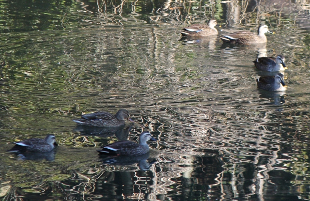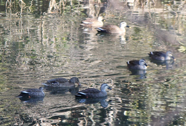 今朝(けさ)の安場池(やすばいけ)です。池(いけ)の真ん中(まんなか)に鴨(かも)が群(む)れているように見(み)えました。