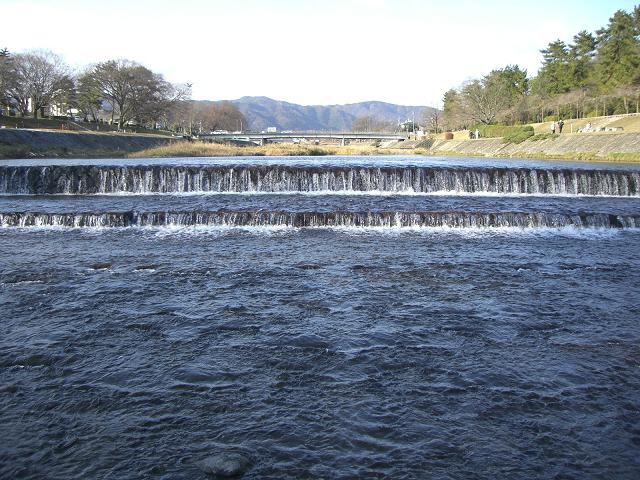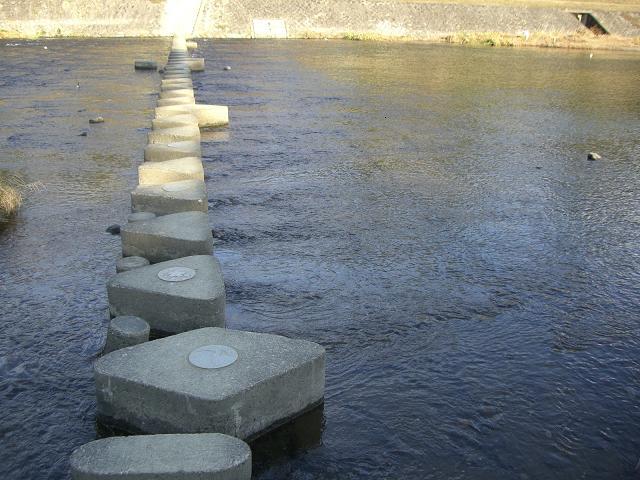 上賀茂神社から下賀茂神社まで歩く途中の鴨川で石渡の個所を見つけました。四角い石や、三角の石が並べられて向こう岸まで歩けるようになっていました。